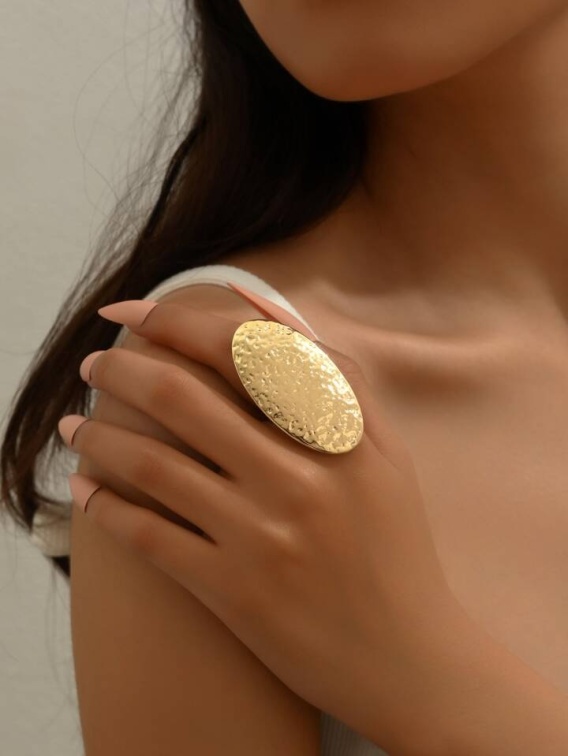 Ten efektowny pierścień przyciąga wzrok swoim dużym, owalnym kształtem oraz unikalnym, młotkowanym wykończeniem, które pięknie odbija światło. Wykonany z metalu o złotym odcieniu, stanowi stylowy dodatek zarówno do codziennych stylizacji, jak i bardziej eleganckich zestawów.